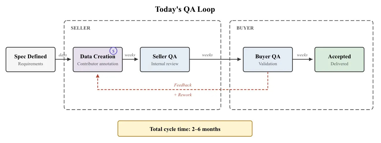 Assessing training data quality today is slow, labor-intensive, unreliable, and haunted by bad incentives. Despite the industry producing ever-increasing volumes and variety of data, brute-force manual audits remain the predominant QA practice. Human reviewers certify thousands of samples one at a time, and the process is repeated twice because the seller and buyer don’t trust each other to catch all the issues. Each round of data spec, production, seller QA, delivery, buyer QA, and feedback can take months to complete.