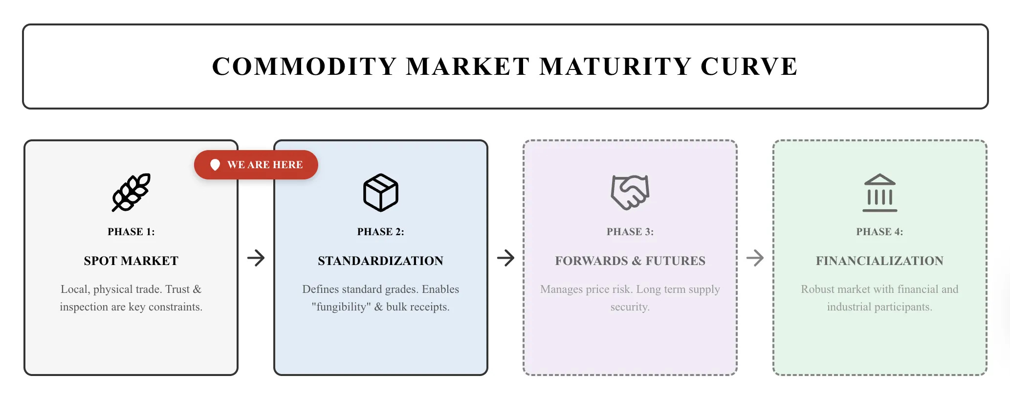 When something suddenly becomes valuable, the first phase of market formation is defined by opaque, bilateral deals for the physical good and immediate delivery, aka the spot market. The market is small, inefficient, and fragmented. Because there are no standards, every buyer must physically inspect the goods to ensure quality, e.g., checking that the wheat isn’t moldy or the gold is pure. The first generation of brokers emerges somewhere in the middle of this mess. As volume grows, trust and inspection become constraints.