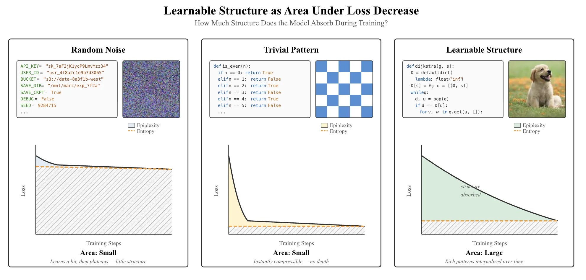 By contrast, when a model trains on data with rich, compositional structure, such as the source code for Dijkstra’s algorithm, the loss decreases gradually over time. The model must internalize abstractions around graphs, priority queues, and shortest paths. This sustained decrease corresponds to structure being absorbed into the weights, producing a large epiplexity value.